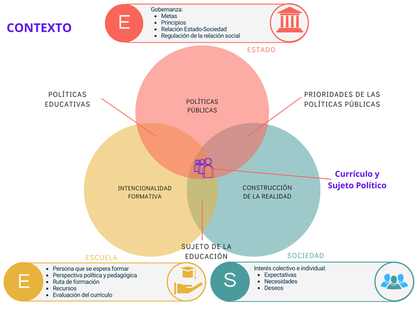 Finalmente, aparece el currículo como el elemento integrador del Estado, la Escuela y la Sociedad; el currículo se construye en las interacciones y las prácticas educativas y en las relaciones de éstas con la sociedad y con las metas políticas y sociales que un país quiere.